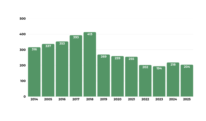У 2025 році виникло нових осередків шкідників і хвороб лісу на площі 86,1 тис. га, ліквідовано заходами боротьби 96,1 тис. га, згасло під впливом природних факторів 55,7 тис. гектарів. Залишок осередків на 31 грудня 2025 року склав 437,6 тис. гектарів.