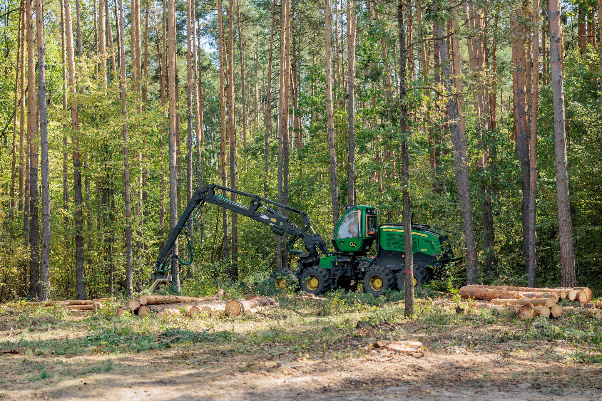 Харвестер John Deere 1270G заміняє в середньому 25-30 працівників, мінімізує техногенний вплив на лісові ґрунти та допомагає уникнути зловживань при заготівлі, адже бортовий комп’ютер підраховує об’єм деревини та автоматично вносить інформацію в базу даних.